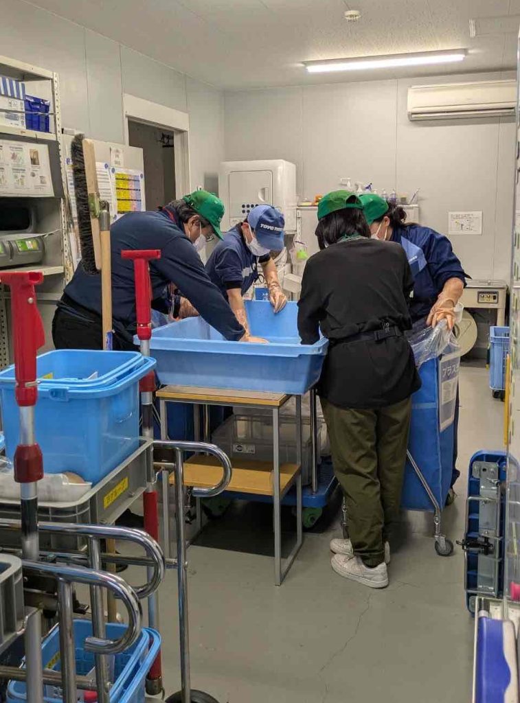 この季節きせつならではの通勤経路つうきんけいろ葉清掃ばせいそうや、日々ひびおこなっている資源しげんゴミの分別作業ぶんべつさぎょう床洗浄機ゆかせんじょうき使用しようした食堂清掃等しょくどうせいそうなどさまざまな作業さぎょうしょうがいのある社員しゃいん一緒いっしょ作業さぎょうすることで注意ちゅういするてんや、実際じっさい作業さぎょうしないとからない作業さぎょうむずかしさを体験たいけんしていただくことができました。